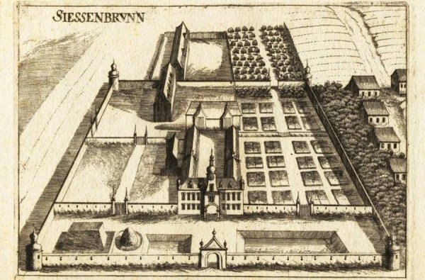 A copper plaque by Georg Mathias Vischer in 1672 shows the Renaissance Manor 'Siessenbrunn' with the surrounding buildings, gardens and park.